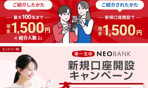 楽天銀行 第一生命支店の新規口座開設キャンペーンで1500円無料ゲット!紹介して最大1万5000円&デビット利用で500円!
