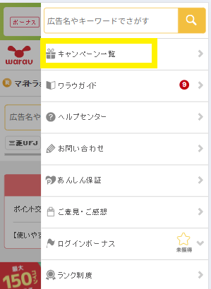 尚、キャンペーンページには、ワラウにスマホからアクセス後、右上の三本線をタップし、キャンペーン一覧をタップして、ウエル活報告バナーをタップすることで辿り着くことができます。